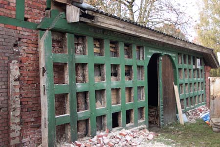 Bauernhausrest: Vordergiebel, Seitenwände (umgesetzt in jüngeren Anbaubereich), mehrere Deckenbalken erhalten. Jeweils unabhängig verwendbar.